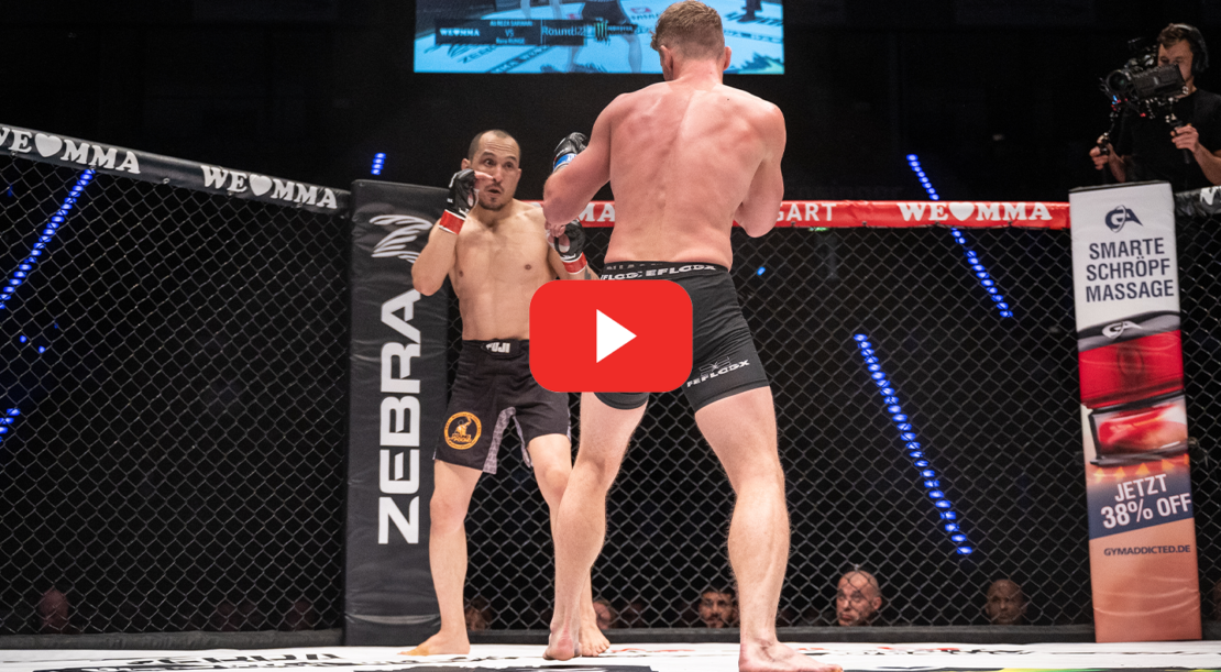Es kam worauf alle in Stuttgart hingefiebert hatten, der Titelkampf im Leichtgewicht. Ein Fight wie gemacht für die Premiere von We Love MMA in der Porsche-Arena. Ein Kampf, der in die Geschichtsbücher von Deutschlands MMA einziehen dürfte. Der bekannte Gorilla Fighthouse MMA Fighter Rene Runge stellte sich dem gefürchteten Ali Sarwari von Pound for Pound München. Es entwickelte sich ein packender Kampf, der vom Ringen am Boden geprägt war. Sarwari verklammerte sich förmlich an Runge. Kurz nach Beginn der zweiten Runde musste Ali allerdings aufgrund der Folgen eines Armhebels in der vorangegangenen Runde selbst vorzeitig beenden. So einen Sieg hat sich Rene bestimmt nicht vorgestellt, aber er zollte seinem Gegner großen Respekt nach dem Kampf. Ein wahrer Champion!