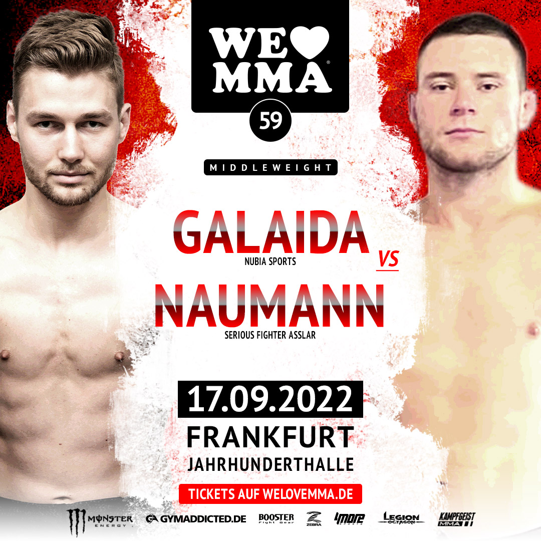 In einem weiteren spannenden Duell treffen Leon Naumann (Serious Fighter Asslar) und der Wiesbadener Andris Galaida aufeinander. Galaida stand erst im Mai dieses Jahres im We Love MMA Käfig, wo er nach drei Jahren Auszeit gegen einen bärenstarken Kevin Hangs das Nachsehen hatte. Nun soll nur 30 Kilometer von seinem Zuhause ein Sieg her. Mit Naumann steht dem Wiesbadener einer der hoffnungsvollsten jungen Fighter des deutschen Mittelgewichts gegenüber. Der Mann aus Asslar trainiert unter einem, wenn nicht dem Veteranen der deutschen MMA Szene. Mario Stapel absolvierte selber über 40 Profikämpfe und kann auf eine bewegte, internationale Karriere zurückblicken. Solides Groundgame steht auf der Visitenkarte von GracieAsslar.