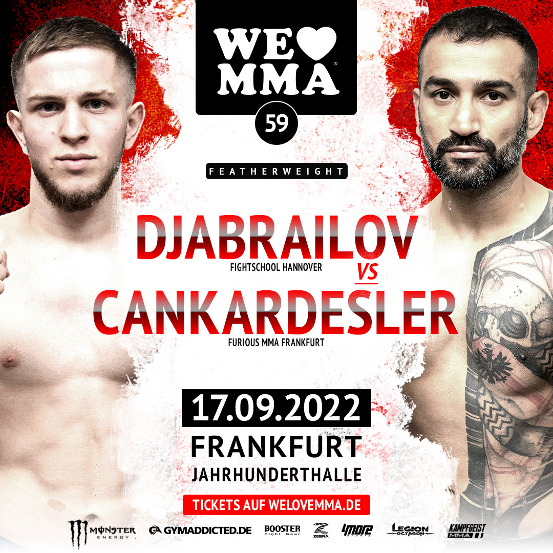 Nach seiner Titelverteidigung in Düsseldorf strebt Islam Djabrailov nach höheren. Der Hannoveraner hat sich zum Ziel gesetzt auch eine Gewichtsklasse höher, im Federgewicht, den Titel zu holen. Die erste Hürde, die ihm We Love MMA Matchmaker Sven Neumann dafür stellt, könnte kaum höher sein. Sein Gegner Ömer Cankardeslar aus Frankfurt ist mit 26 Kämpfen einer von Deutschlands erfahrensten Kämpfen und mit allen Wassern gewaschen. Zwar war Cankardeslar in letzter Zeit nicht vom Glück verfolgt und einige Niederlagen einstecken. Bei seinem Heimspiel kann der Frankfurter aber auf lautstarke Unterstützung hoffen und sich wieder in den Fokus bei We Love MMA kämpfen, wo er bereits Ende 2019 vor einer Titelchance stand.