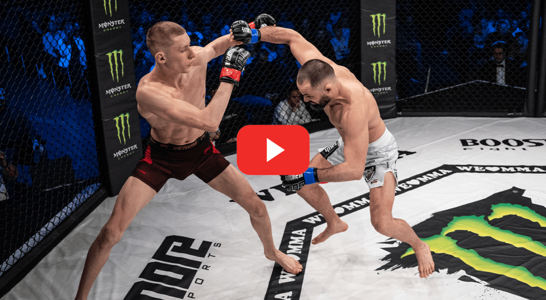 Ein Leichtgewichtskampf der Extraklasse: Andreas Rasumny (MMA Traunreut) gegen Ruslan Malsam (MMA Mundial). Ruslan war bereits bei We Love MMA 20 mit dabei und feierte in München sein Profi Comeback. Der Kampf geht offensiv los. Beide schlagen erst aufeinander ein und verlagern dann den Fight auf den Boden. Ganze drei Male geht es so hin und her. Doch auch dieses Duell sollte vorzeitig enden. Nach 4:18 Minuten in der ersten Runde muss Malsam nach einem Choke abklopfen und Rasumny ist der Sieger des Kampfes.