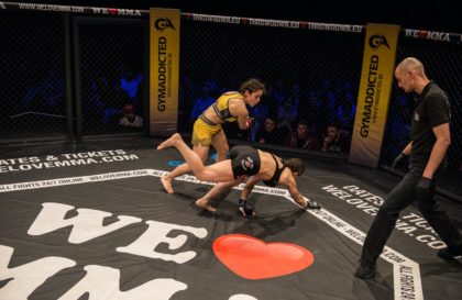 Dann stiegen die Frauen in den We Love MMA Käfig. Kataryna Lyzohub (V8 Fitness Wolfsburg) und Franziska Chwalicz (APIS Martial Arts München) nahmen es miteinander auf. Dabei startete die Wolfsburgerin mit einer guten links-rechts Kombination, nach der beide Kämpferinnen zu Boden gehen. Hier schafft es die Münchnerin sich den Rücken ihrer Gegnerin zu sichern und den Kampf mit einem Rear Naked Choke bereits in der ersten Runde zu beenden.