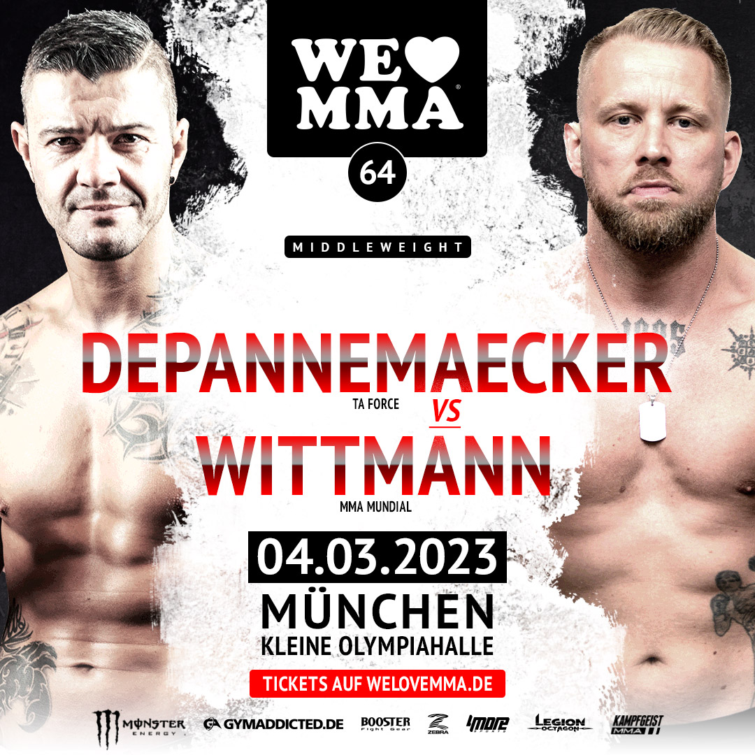 Es war nicht leicht einen gebührenden Gegner für den MMA Mundial Gründer und Reality-TV Star Mario „Fist of Buddha“ Wittmann zu finden. Doch mit David „Le Legionaire“ Depannemaecker konnte man einen mutigen Weltergewichts-Kämpfer finden, dem das MMA im Blut liegt und der sich Wittmann mit einer Kusshand stellt. Nach seiner jetzigen Siegesserie bei We Love MMA ist der Titel für Wittmann, sollte er den Fight gewinnen zum Greifen nah. Er kämpft sein 16. Jahr und hat bereits MMA Geschichte geschrieben. Doch auch der Nürnberger Depannemaecker hat eine lange MMA Geschichte, auf die er zurückgreifen kann. Und auch er ist Gym Besitzer, und das von einem der renommiertesten Gyms in Deutschland: dem TA Force. Beide sind sich siegessicher und wollen in München die Fäuste sprechen lassen. Ein harter und blutiger Kampf steht uns bevor. Lasset die Spiele beginnen!
