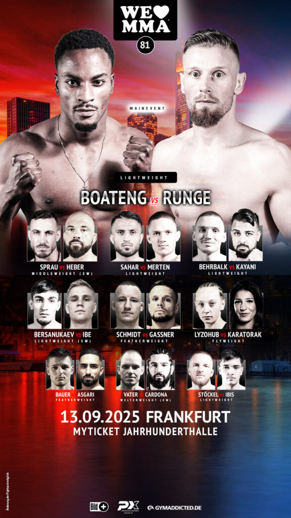 Am 13. September kommt Deutschlands härteste Liga wieder nach Frankfurt. Jetzt steht die Full Fightcard für das Mega-Spektakel im Oktagon und verspricht krachende Action und Frauen-Power im Cage – Welcome to We Love MMA 81!