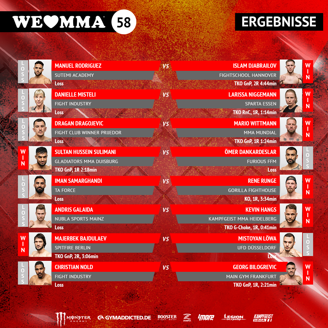 Damit geht ein spannender Kampfsportabend in Düsseldorf zu Ende. Wer nicht live dabei sein konnte, der hat die Möglichkeit alle 10 Kämpfe von We Love MMA 59 auf Bild.de zu verfolgen.