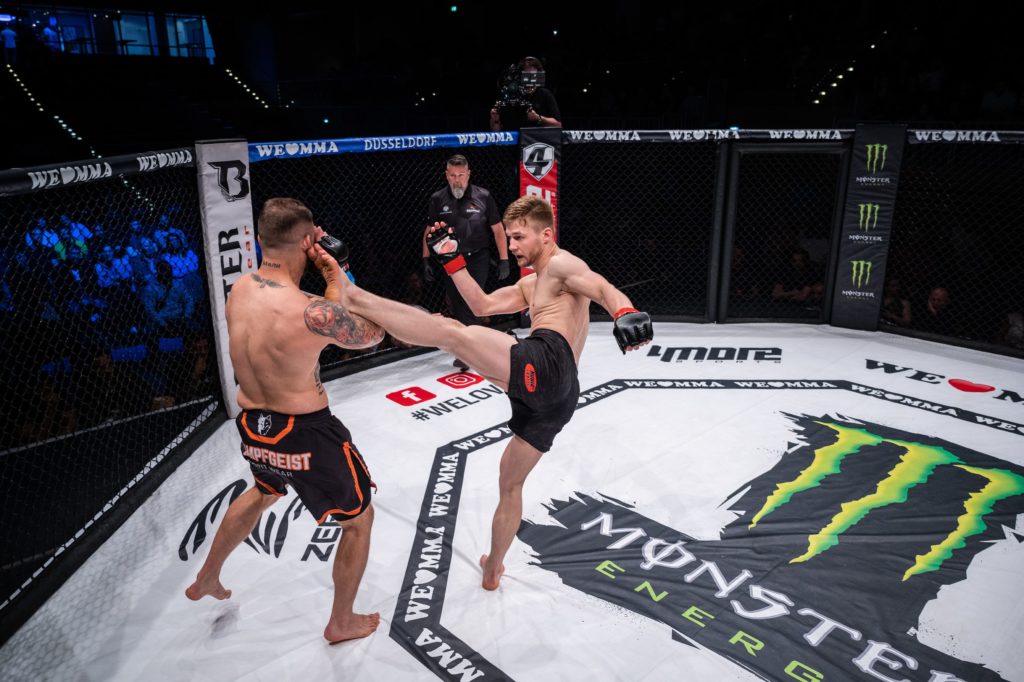 Im Mittelgewicht trafen Kevin Hangs (Kampfgeist Reilingen) und Andris Galaida (Nubia Sports Mainz) aufeinander. Hangs fuhr zuletzt zwei Siege ein und ist mit insgesamt sechs Kämpfen für We Love MMA ein wahrer Veteran der Serie. Ihm gegenüber stand mit Andris Galaida ein Fighter, der nahezu drei Jahre pausierte, um sein Studium abzuschließen und jetzt sein Comeback feierte. Die Erfahrung von Hangs was sofort zu erkennen, er diktierte den Kampf im Stand ab der ersten Sekunde. Als Galaida versuchte den Fight auf den Boden zu verlagern, konnte Hangs einen Guillotine Choke ansetzen und das Duell nach 41 Sekunden für sich entscheiden. Schnellster Fight des Abends.In einem weiteren Mittelgewichtskampf stiegen Iman Samarghandi (Ta Force) und Rene Runge (Gorilla Fighthouse MMA) in den Cage. Wobei Runge, mit Hawaihemd und Sonnenhut beim Einlauf bekleidet, eher in den Käfig „surfte“. Die zwei Fighter begrüßten sich auch nicht zum ersten Mal im Cage. 2019 standen sich schon mal gegenüber. Damals sahen die Punktrichtern Runge knapp vorne. Auch dieses Mal schenkten sich beide nichts. Allerdings bearbeitete Runge seinen Gegner am Gitter mit mehr Druck und konnte sich schließlich in eine Position bringen, in der er harte Treffer auf Samarghandi einprasseln ließ. Nach 3:34 Minuten musste der Ringrichter den Kampf mit TKO abrechnen. Die Massen feierten den Sunnyboy vom Gorilla Fighthouse, der im Interview nach vier Siegen bei We Love MMA seinen Anspruch auf einen Titelkampf einforderte.