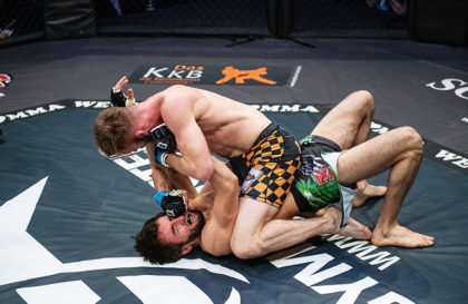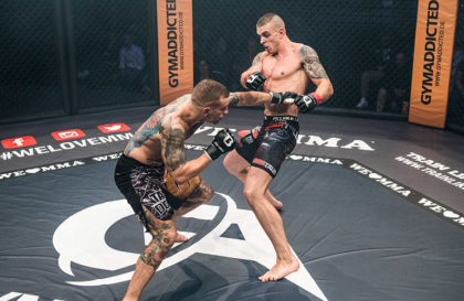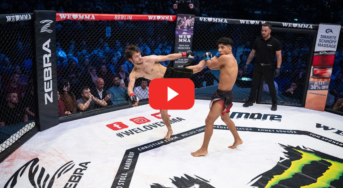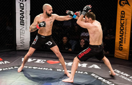 Mit Igor Potereanu vom Bulldog Gym Karlsruhe und Sebastian Salaza von der Fightschool Hannover gingen die leichtesten Jungs des Abends in den Cage. Ein schnelles Duell im Catchweight bis 59 Kilogramm stand an. Es beginnt mit einem Abtasten, bis sich beide Kämpfer mit Kicks und Punches zum Ende der ersten fünf Minuten einiges einschenken. Die zweite Runde verlegte sich auf den Boden bis Salazar ein heftiges Groundandpound auf Potereanu einprasseln ließ, das zum Referee Stoppage führt.
