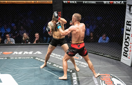Ein ausgewogener Sarwari weicht vor dem Druck des Rechtsauslegers Mutschler zurück. Mutschler benötigt ein paar Runden zum warm werden, beginnt jedoch in der dritten Runde sein Ziel zu finden.
