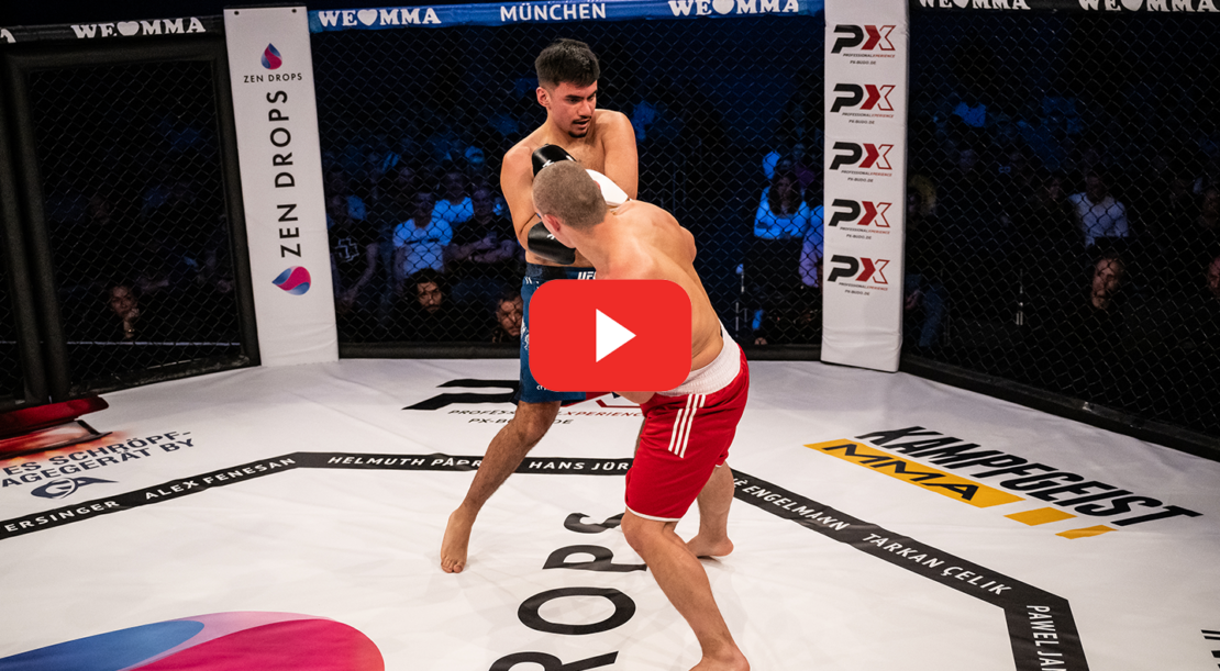 Zur 70. Runde von We Love MMA ging es aber erst einmal mit einem Boxfight im Oktagon los. Vasyl Klyusa von Pound4Pound München und Mohammed Koschan Yousufi vom Munich Allstars Gym trafen bei dieser Premiere aufeinander. Nach drei Minuten des Abtastens legte Vasyl in Runde 2 mit einer dreier Kombination los, die in einem massiven Kinnhacken mündete und seinen Gegner ins Straucheln brachte. Das veranlasste Thomas Eichinger, den Trainer von Mohammed, das Handtuch zu werfen und so holte sich der Pound4Pound Kämpfer den Sieg.