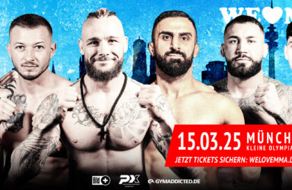 Zum krönenden Abschluss stiegen Levan Chokheli von Phoenix Kassel und Issa Isakov vom Bulgarian Top Team in den Käfig. Beide Kämpfer, die mit sieben Siegen eine nahezu identische Kampfbilanz aufwiesen, ließen sofort nach dem Gong die Fäuste fliegen. Im Getümmel konnte Levan nach 57 Sekunden das Knie ans Kinn von Issa hämmern. Das zeigte Wirkung, Issa war mächtig angeknockt. Nach zwei weiteren Kopftreffern schritt der Referee ein und brach den Kampf zugunsten von Levan ab. Damit ging die grandiose 52. Ausgabe von We Love MMA in Düsseldorf zu Ende.