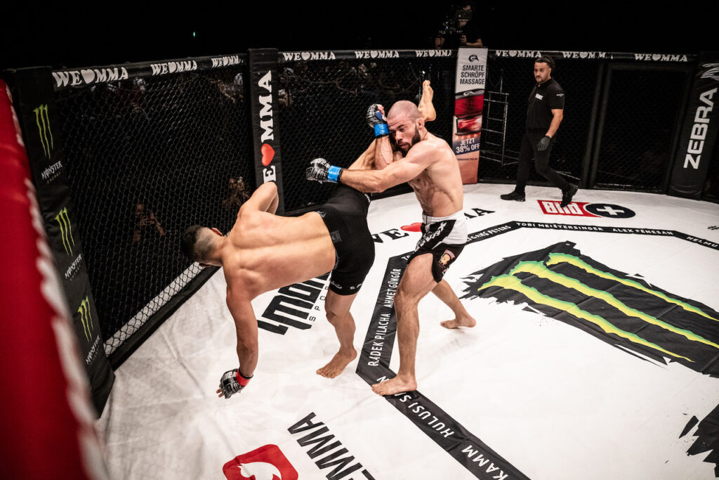 Im ersten Kampf nach der Pause lieferten sich Stephan Gueida von der Phoenix Sport Academie Kassel und Moritz Merten vom Main Gym Frankfurt eine MMA-Schlacht vom Feinsten. Die beiden legten ihr Pro MMA-Debüt hin und gaben dabei Alles. Beide gingen aufeinander los, doch Merten führte deutlich an, bis es nach der zweiten Runde durch einen Doctor‘s Stoppage, wegen einer Schulterverletzung seitens Mertens zum Ende und dem Sieg Gueidas kam.