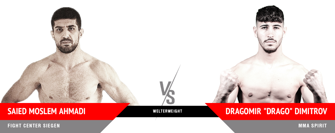 Im letzten Fight vor der Pause wollte Drago Dimitrov nach seiner Niederlage bei We Love MMA 65 in Hannover endlich sein vollstes Potential ausschöpfen und betrat den Cage mit hocherhobenen Fäusten. Doch auch Publikumsliebling Saied Moslem Ahmadi hat es faustdick hinter den Ohren. Dieser Kampf war so schnell wieder vorbei wie er angefangen hatte. Der kurze Kampf verlief ausgeglichen, bis nach 4:50 Minuten Drago Dimitrov genug vom Schlagabtausch hatte und Ahmadi zu Boden brachte. Dann setzte er zum Groundandpound an und holte damit den Sieg.