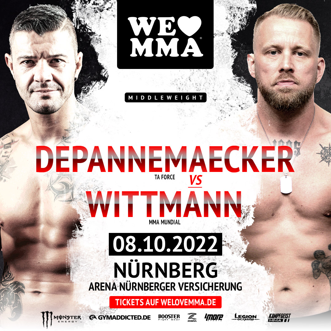 Mario Wittmann vs. David Depannemaecker, das ist ein Aufeinandertreffen zweier altgedienter Haudegen in der Maincard von We Love MMA 60 und der inoffizielle Fight um den Franken-Titel. Im Duell der beiden Lokalpatrioten ist davon auszugehen, dass harte Fäuste fliegen werden.Die 60. Ausgabe von We Love MMA am 8. Oktober 2022 in der ARENA Nürnberger Versicherung verspricht packende Fights mit einigen der besten deutschen MMA Sportler und internationalen Hochkarätern. Einlass ist für alle MMA-Fans erst ab 18 Jahren möglich. Karten für das Kampfsportspektakel in Nürnberg und alle anderen We Love MMA Events gibt es ab 20,00 Euro (incl. VVK-Gebühr) unter der Tickethotline 01806-570070 oder auf www.welovemma.de.