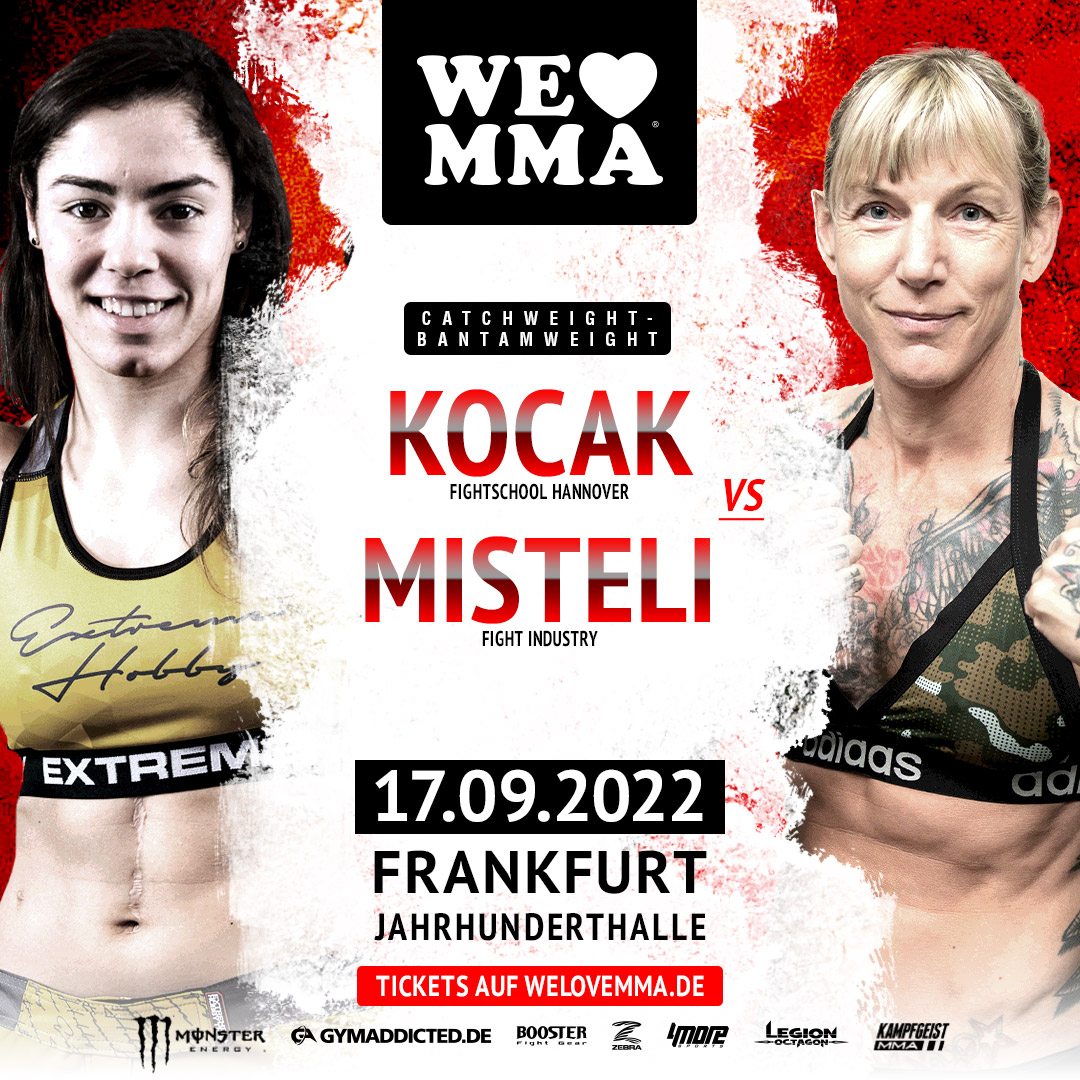 Zur Frankfurter Premiere von We Love MMA in der Jahrhunderthalle gibt es geballte Frauenpower im Käfig. Es treffen zwei erfahrene Kickboxerinnen aufeinander: Dilara Kocak (Fightschool Hannover) vs. Danielle Misteli aus der Schweiz. In ihren Paradedisziplinen, dem Kickboxen, sammelten beide bereits zahlreiche nationale als auch internationale Titel ein. Dilara Kocak sagt zu We Love MMA: „Ich freue mich riesig auf die Herausforderung MMA und will natürlich auch hier irgendwann Titel gewinnen. Ich habe meinen ersten Kampf bei We Love MMA gemacht und mein großer Traum ist es Champion zu werden.“ Es ist ein Feuerwerk aus Schlagkombinationen und Kicktechniken zu erwarten, zelebriert von zwei Expertinnen ihres Handwerks.