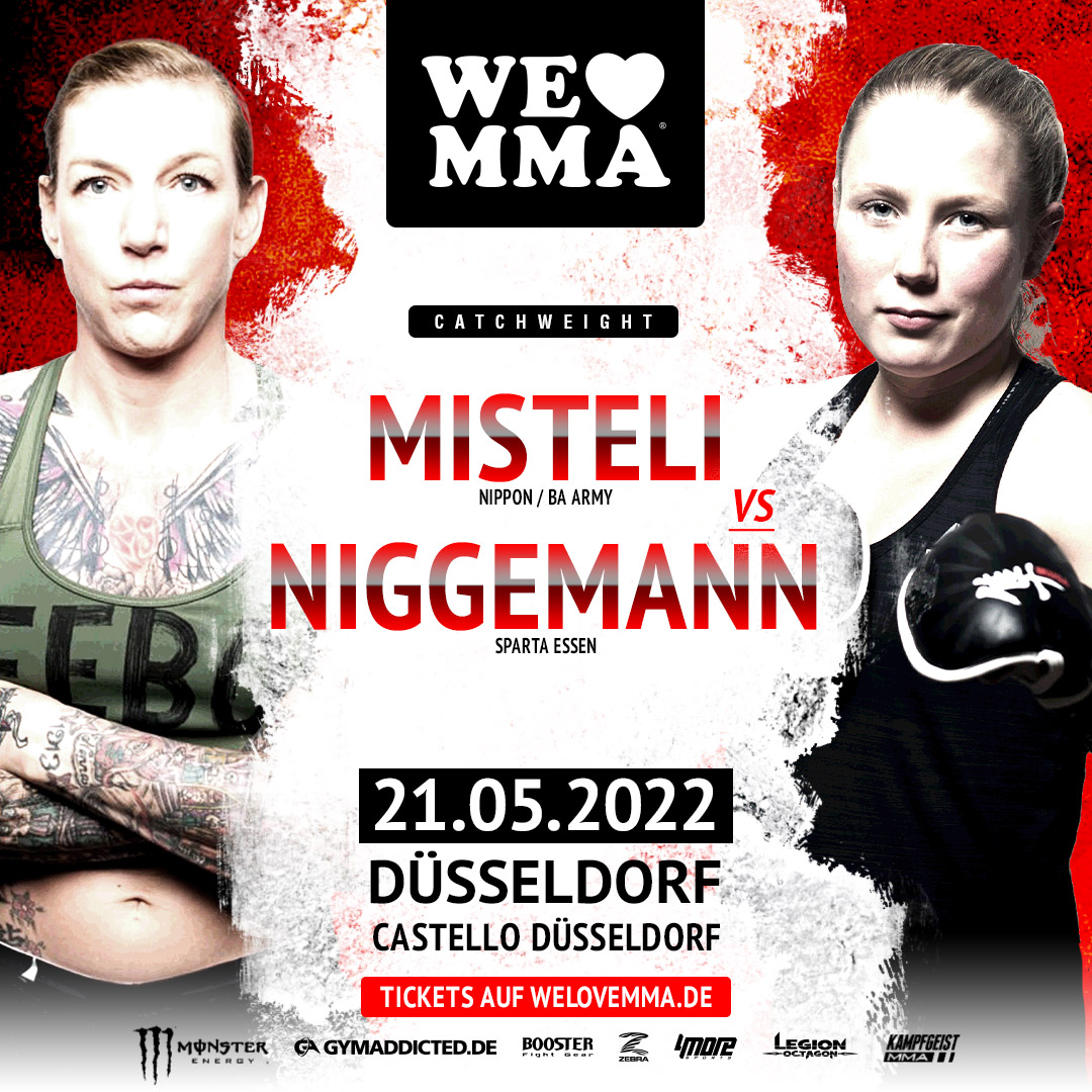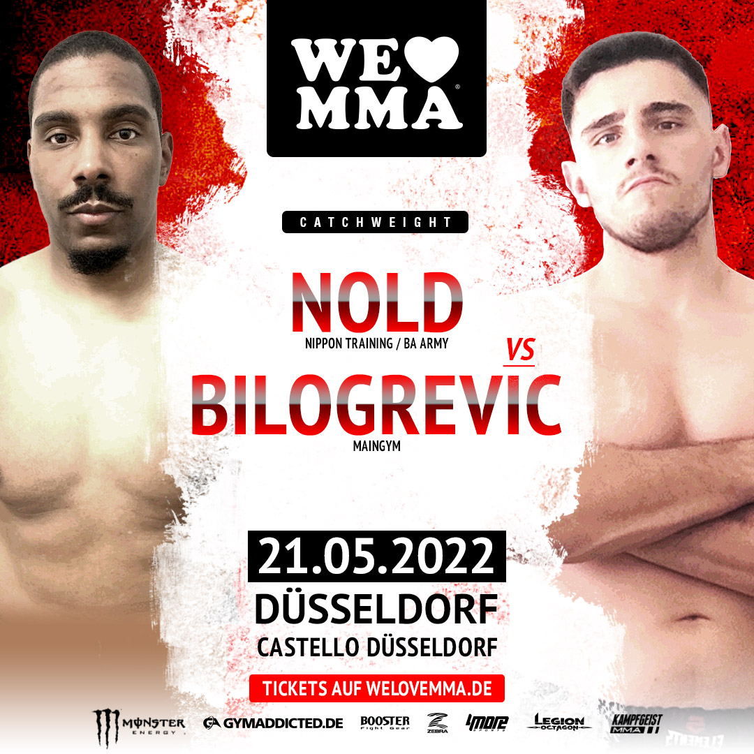 Nachdem Islam Djabrailov von der Fightschool Hannover 2019 in Berlin zum ersten We Love MMA Champion im Bantamgewicht gekürt wurde, verhinderte die Pandemie bislang eine Titelverteidigung. Jetzt, wo es wieder möglich ist viele Zuschauer in das CASTELLO Düsseldorf zu lassen, ist der perfekte Playground für den Titelkampf geschaffen! Doch kein Kämpfer aus Deutschland war gewillt, sich dieser Herausforderung zu stellen. Also musste der We Love MMA Machmaker im europäischen Ausland nach einem Fighter suchen. Und den fand er in Spanien bei der Sutemi Academy in Sevilla. Manuel „Ninja“ Rodriguez wird sich im Mai auf den Weg nach Deutschland machen, um sich der größten Herausforderung seiner bisherigen Laufbahn zu stellen, dem We Love MMA Titelkampf im Bantamgewicht gegen Islam Djabrailov.Es war ein krasser Kampf zwischen Larissa Niggemann und Kelig Pinson bei We Love MMA 52 in Düsseldorf, den Niggemann nach zwei actiongeladenen Runden per Punktsieg gewann. Die Siegerin des internationalen Grappling Turniers 2016 aus Essen und begabte K1 Fighterin vom MMA Corps Ruhrpott kehrt nun zurück in den Cage im Castello und bekommt es mit Danielle Misteli zu tun. Die Kämpferin aus Pfäffikon in der Schweiz möchte ihren ersten Profi MMA Sieg holen um ihrer MMA Karriere damit einen Kick geben. Kicks verteilt die Schweizerin von der Nippon / BA Army auch gerne an ihre Gegner. Das Smoothcomp Combat Turnier gewann sie im Federgewicht. Jetzt geht es im Catchweight gegen Larissa Niggemann und das dürfte für Danielle Misteli das härteste Duell ihrer Karriere werden. Ein actiongeladener Kampf der Powerfrauen steht bevor.Christian Nold, berühmt und berüchtigt für seinen Rear Naked Choke, hat seit seinem Käfigdebüt nur Siege eingefahren. Jetzt steigt der Schweizer von der Nippon / BA Army zum ersten Mal in den We Love MMA Cage und trifft im Catchweight auf Georg Bilogrevic. Der Maingym Fighter muss diesen Kampf unbedingt gewinnen, nachdem er seinen letzten Fight gegen Marc Doussis in der zweiten Runde durch K.O. verlor. Bilogrevic fokussierte sich in den letzten beiden Jahren voll und ganz auf das Training für sein Comeback und dürfte bestens vorbereitet sein, auf das Duell mit dem Schweizer We Love MMA Debütanten.In den bisherigen Jahren konnten die Fans in NRW acht grandiose Kampfsportnächte miterleben. Auch zur 58. Ausgabe serviert das We Love MMA Team wieder atemberaubende Action. Weitere Kämpfe werden in Kürze bekannt gegeben.
